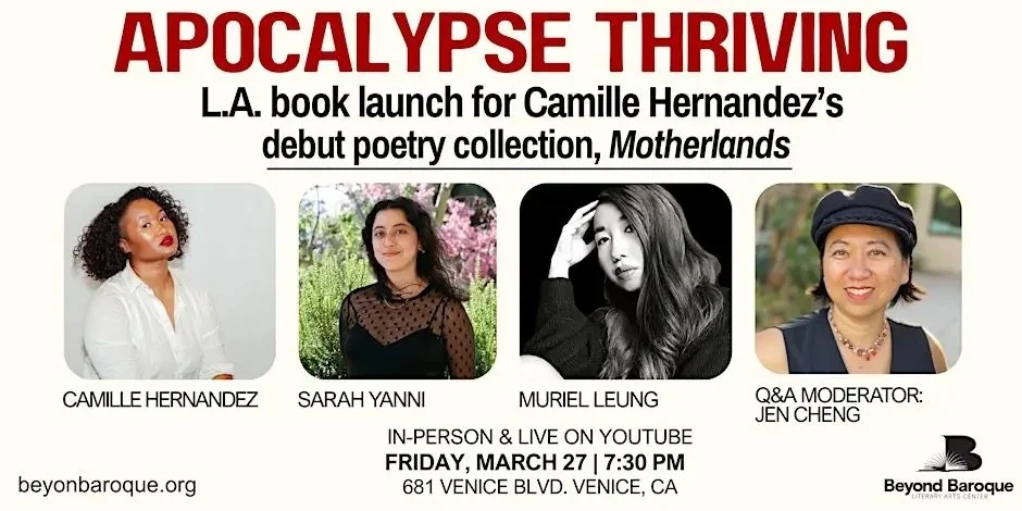 Beyond Baroque presents the Los Angeles book launch celebration for Camille Hernandez's debut poetry collection, Motherlands, a lyrical meditation on the parallel journeys of motherhood, immigration, and amputation, exploring how the severance of migration echoes the raptures of childbirth. Hernandez’s work explores the fluid intimacy and resilient survival found in relationships between unseen women. Featuring Camille Hernandez, Sarah Yanni, and Muriel Leung. Moderated by Jen Cheng.
